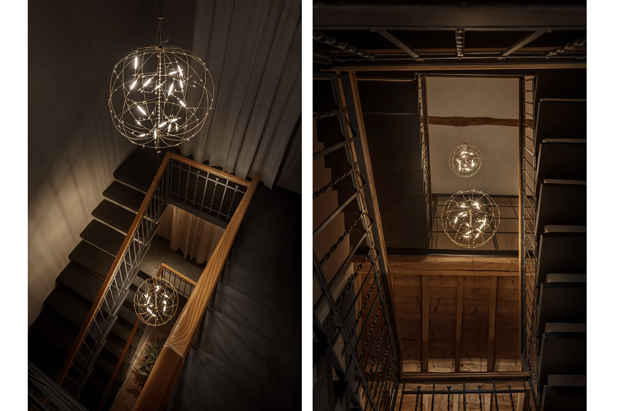 La composición lumínica se desarrolla verticalmente, alcanzando una altura total de 650 cm, y se articula a través de dos luminarias Pòta! con un diámetro de 50 cm, seguidas de un Spot Light al final de la configuración, que proyecta un haz concentrado que casi sella su equilibrio formal y luminoso. Para garantizar la correcta instalación de esta creación personalizada, se fabricó una base cilíndrica a medida para adaptarse a la inclinación del techo. La voluminosa estructura esferoidal de latón de Pòta! alberga 18 unidades de luz hechas a mano que integran la moderna tecnología de filamentos LED, trazando un mapa suspendido entre la precisión y la irregularidad.
