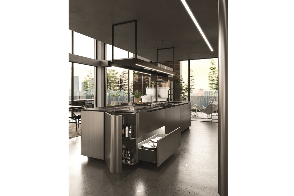 Ak_Project Circle, en el centro de la escena, nace de la idea de un espacio fluido, continuo y envolvente, en el que la forma circular se convierte en un gesto proyectual y simbólico. La cocina dialoga de forma natural con la zona de estar, creando ambientes abiertos y coherentes, en sintonía con los nuevos escenarios del habitar contemporáneo.