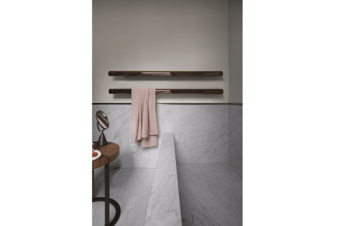 El toallero calefactado T.B.T., diseñado por Ludovica Serafini + Roberto Palomba, reduce el desorden al mínimo absoluto: un solo tubo de solo 7 cm de diámetro, disponible en versiones hidráulicas, eléctricas o mixtas, capaz de adaptarse a multitud de configuraciones.