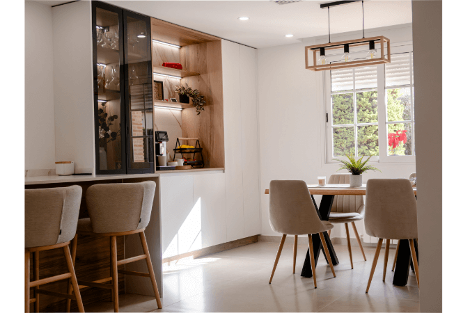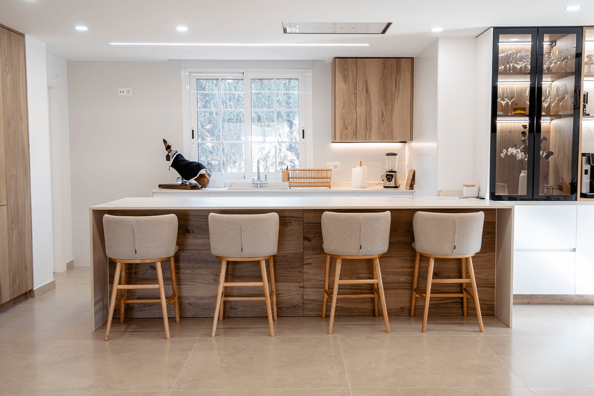 La iluminación es una de las grandes protagonistas de esta amplia cocina nórdica en blanco y madera, diseñada por el estudio murciano Formas Cocinas.