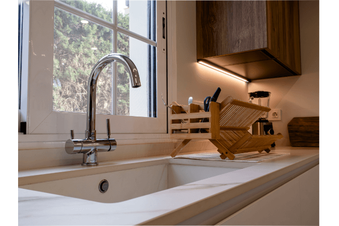 El minimalismo propio del estilo nórdico se refleja también en la elección de una placa de inducción invisible y una campana de techo, que además de ser muy funcionales reducen el ruido visual en una cocina abierta al salón como esta. La placa invisible se ha integrado a la península con el Calacatta Gold, modelo de porcelánico de ABK Stone. El mismo material se ha utilizado para integrar el fregadero y para revestir el frente del desayunador.