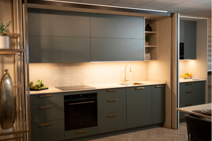 Cocina Innova: cocina oculta con puertas escamoteables y desayunador con un diseño moderno, minimalista y muy equilibrada pensada para tipologías donde el orden visual es prioritario. Los frentes en tono verde abeto transmiten calma y conexión con la naturaleza, combinándose con tiradores metálicos en latón cava cepillado que añaden calidez. La integración de los muebles superiores y la continuidad de los frentes refuerzan una estética limpia, mientras que la distribución inferior se organiza de forma funcional, con el horno integrado en una posición central que favorece ergonomía y uso diario.
