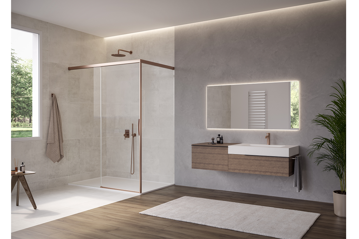 Con perfiles disponibles en una amplia gama de acabados, incluyendo plata mate, plata pulida, aspecto acero inoxidable, cobre perlado, latón perlado y negro perlado, y también ofrecida con el nuevo vidrio bronce, además de otras variantes de vidrio, la nueva versión sin marco natura 4000 reafirma el compromiso de Duka con el desarrollo de soluciones de ducha en las que conviven la tecnología, el diseño y la flexibilidad compositiva, mejorando la calidad de la contemporaneidad.