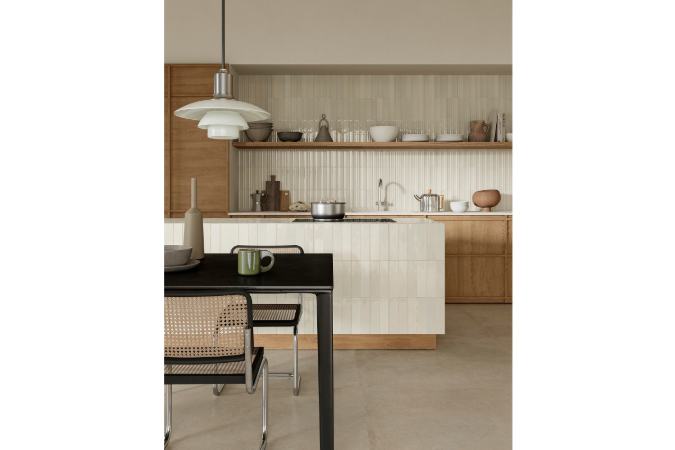 Disponible en formato 6x24 cm con acabado brillante, la colección destaca por su textura viva e irregular, lograda mediante gránulos vítreos que hacen que cada pieza sea única. El esmalte ultrabrillante genera hundimientos y marcas de cocción en los bordes, creando sofisticados efectos cromáticos. La paleta incluye seis tonos cálidos y empolvados, pensados para combinaciones armoniosas o acentos atrevidos.
