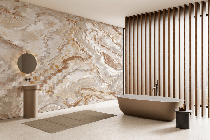 Un mármol con vetas coloridas, vívidas y complejas se deconstruye a lo largo de la pared, dando vida a una solución decorativa refinada y táctil.