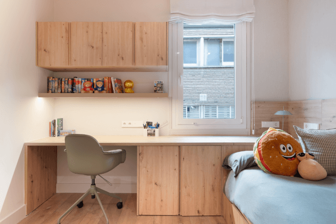Por otra parte, en los dormitorios juveniles mobiliario a medida optimiza cada centímetro, integrando zona de estudio, almacenaje y descanso en un entorno equilibrado, luminoso y perfectamente adaptado a la vida diaria. Los detalles decorativos, discretos pero personales, aportan calidez y reflejan una vivienda vivida, no impostada.