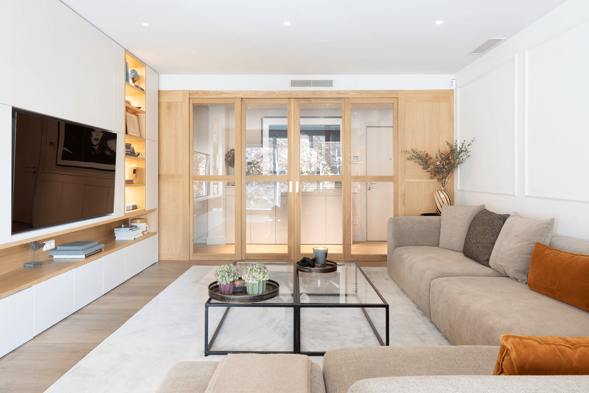 Uno de los grandes valores del proyecto es la captación de la luz natural. En la zona de día, formada por comedor independiente y un amplio salón, las cortinas ligeras de suelo a techo tamizan la luz natural que entra a través de los amplios ventanales. El hall de entrada, antes oscuro, queda bañado por la luz natural gracias a unas robustas puertas correderas realizadas a medida en madera clara y cristal.