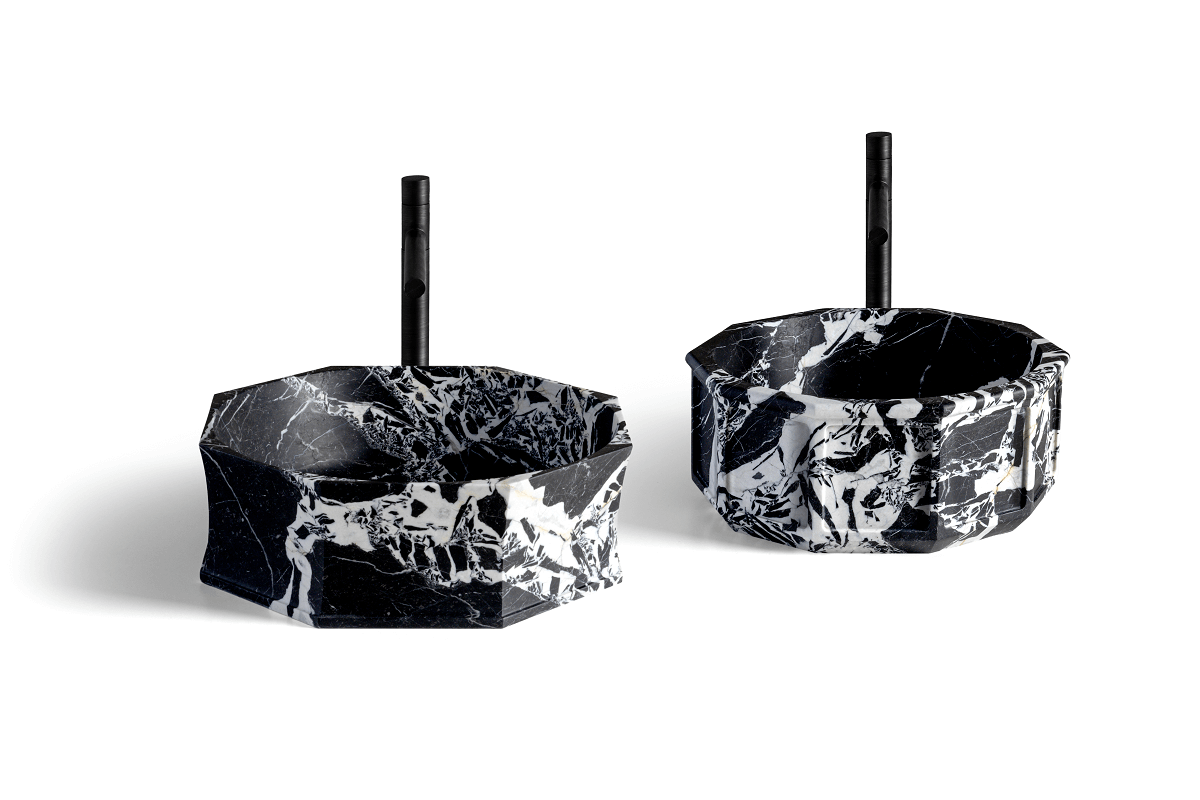 Ambos son lavabos de sobreponer. Musina presenta un perfil interior circular y un exterior octogonal, esculpido a partir de un único bloque de mármol. El borde superior es marcado, con perfiles suaves trabajados, y corona el diseño de la superficie exterior, que se articula mediante sutiles paneles salientes en los vértices de la figura geométrica. Bajo esta elegante estructura, a diferentes profundidades, ligeras inclinaciones en la piedra acompañan la base en una composición que resalta las vetas del mármol, únicas y modeladas por el tiempo para hacer cada pieza irrepetible.