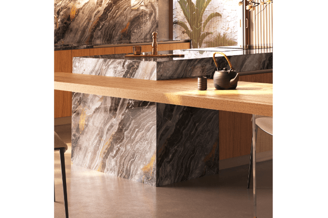 "Hay un momento, en el diseño de una cocina, en el que la materia supera a la forma y la transforma en emoción", afirma Ulisse Narcisi. "Volare no es simplemente una cocina: es un paisaje doméstico esculpido en la materia, un equilibrio calibrado entre volúmenes puros y superficies vibrantes, donde la luz se convierte en elemento proyectual", explica.