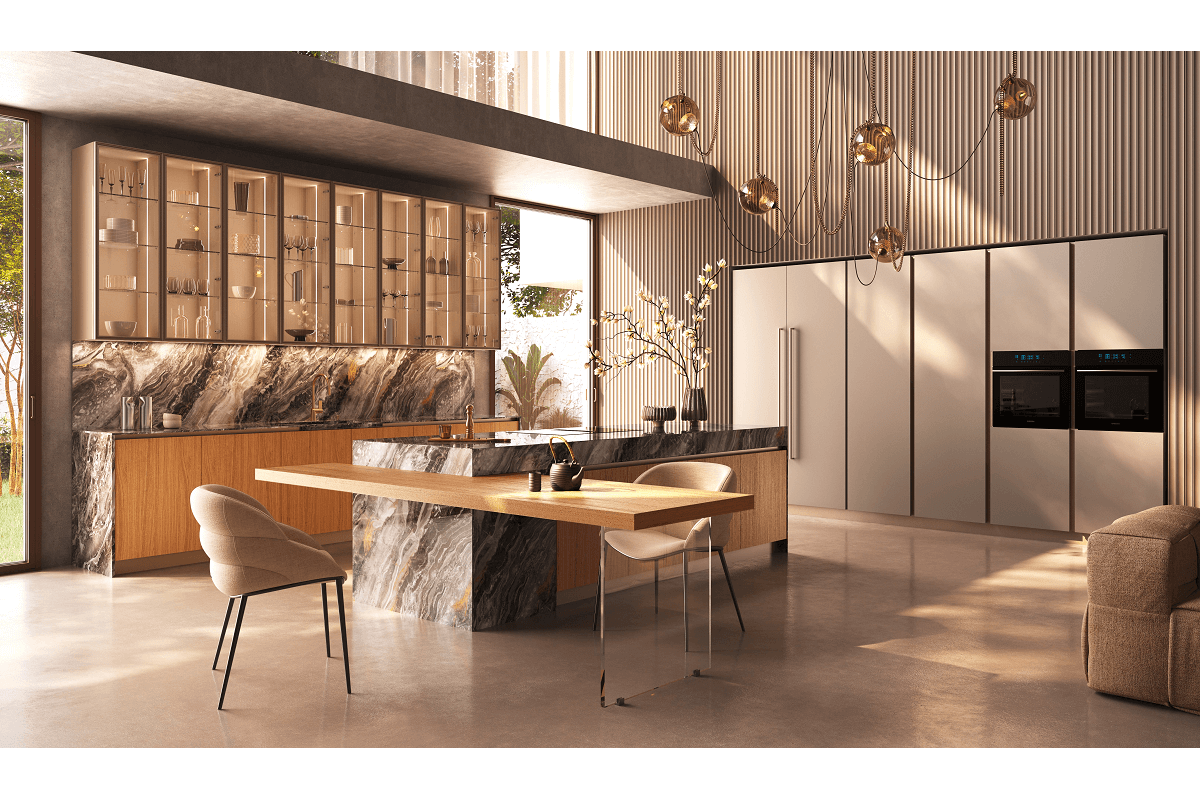 "Volare nace como una experiencia arquitectónica viva: cada volumen y cada apertura definen un ritmo visual y táctil, modulando la percepción y acompañando los gestos de quienes habitan el espacio. La cocina se convierte así en un lugar de relación y emoción, donde llenos y vacíos, luz y materia dialogan para transformar el uso cotidiano en un gesto escenográfico y armónico", explica Ulisse Narcisi.