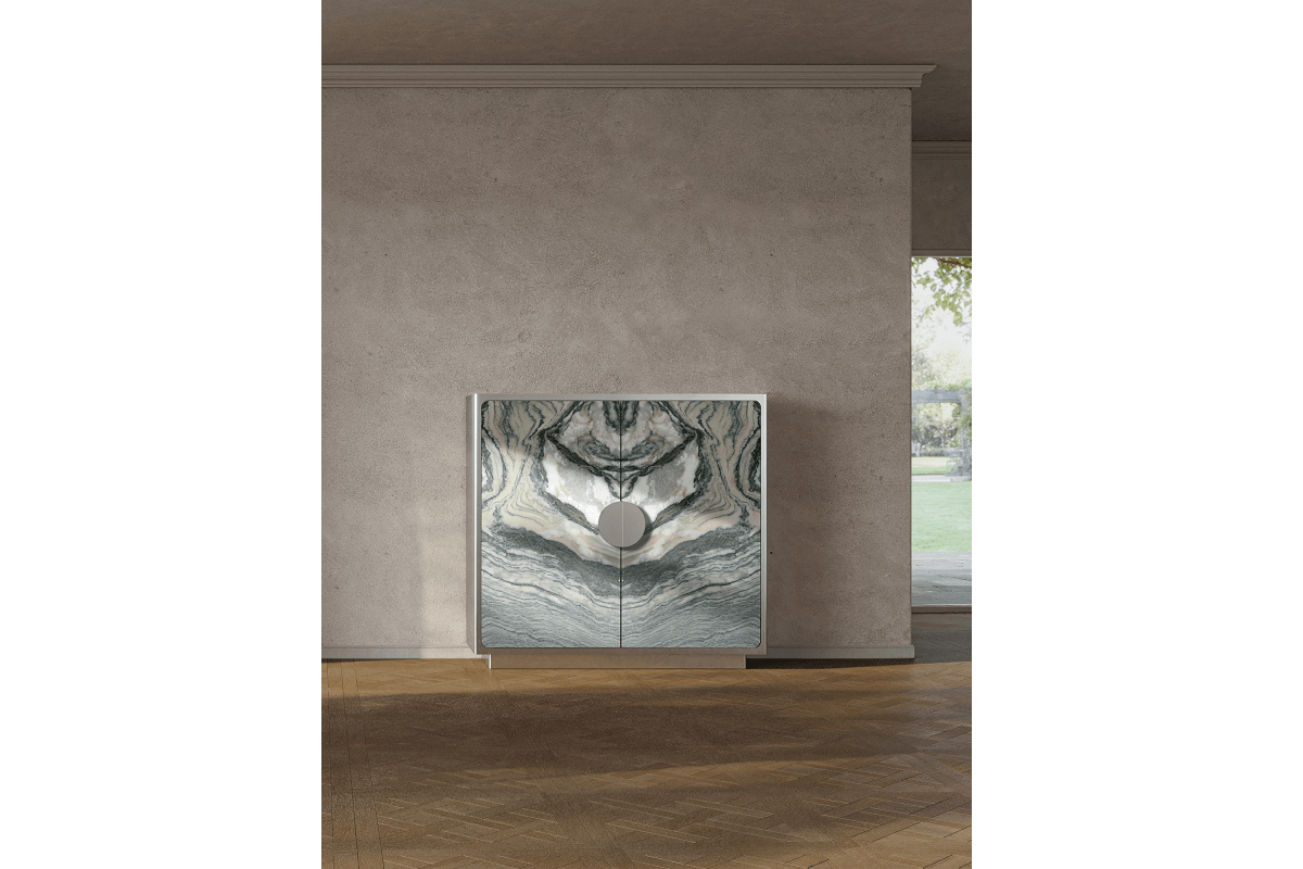 Las nuevas puertas de mármol Cipollino resaltan aún más el impecable diseño del aparador, convirtiéndolo en una pieza emblemática. Las vetas naturales del mármol crean un efecto tridimensional que captura el espacio circundante y garantiza que cada AlterEgo sea diferente del siguiente, lo que le confiere un carácter escultórico. El resultado es un "objeto" contemporáneo con un potente impacto visual.