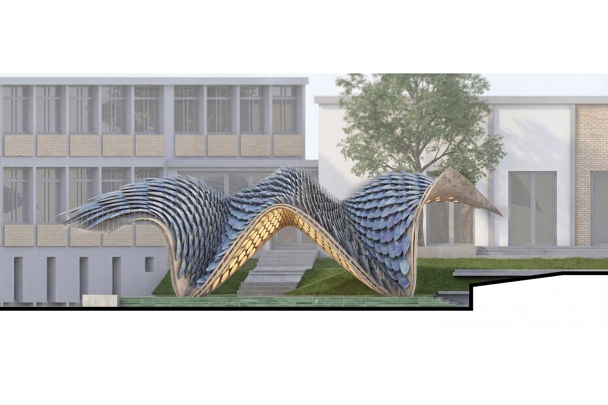 Diseñado por los arquitectos José Ramón Tramoyeres y Javier Cortina, fundadores de ggstudio, y construido por Volúmenes y Vareta, la intervención propone un nuevo modelo de arquitectura cultural: desmontable, reutilizable e itinerante. Con un diseño geométrico orgánico y continuo, la estructura modular ensamblada de madera y cerámica permite su itinerancia internacional, con Milán como próximo destino previsto.