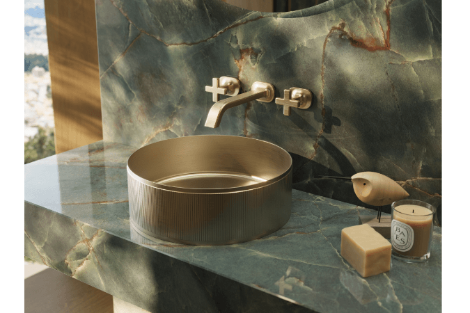 El acabado latón cepillado se consolida como la tendencia de la temporada, extendiéndose a las colecciones Menorca y Rome. Este tono dorado mate aporta una calidez sofisticada a griferías, accesorios y lavabos, logrando una estética premium y atemporal.
