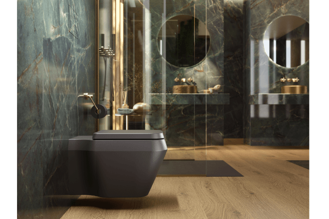 En el plano técnico, el inodoro Vertex se posiciona como el nuevo referente de innovación técnica de la firma. Su estructura, definida por planos facetados y aristas suavemente redondeadas, captura la luz de forma limpia, aportando un carácter escultórico y una presencia impactante al baño sin recargar el espacio. Este modelo suspendido eleva la sensación de orden y amplitud, equilibrando precisión y calma en un solo volumen.