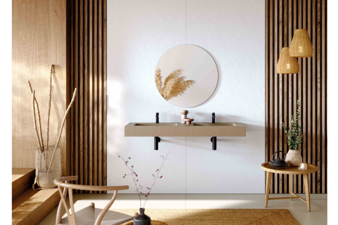 La zona de lavabo también permite explorar distintas formas de organizar el espacio. La encimera Infinity, fabricada en Akron®, ofrece amplias posibilidades de personalización en dimensiones y acabados, lo que permite adaptarla a diferentes configuraciones de baño y crear soluciones a medida que se integran con naturalidad en el conjunto. Integrada sobre el mueble Artic, se convierte en una solución modular, funcional y contemporánea, disponible en acabado madera de olmo o lacado blanco, que contribuye a organizar el espacio y aportar orden visual.