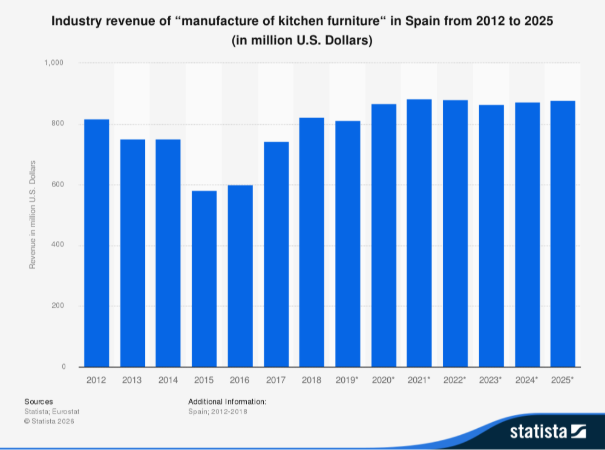 Las cifras de estabilización económica de la industria del mueble de cocina son extrapolables a las del sector del mueble en general. Según la edición de 2025 del informe La industria del mueble en España, elaborado por el instituto tecnológico Aidimme, el sector del mueble cerró el año pasado con un crecimiento del 1,1% interanual.