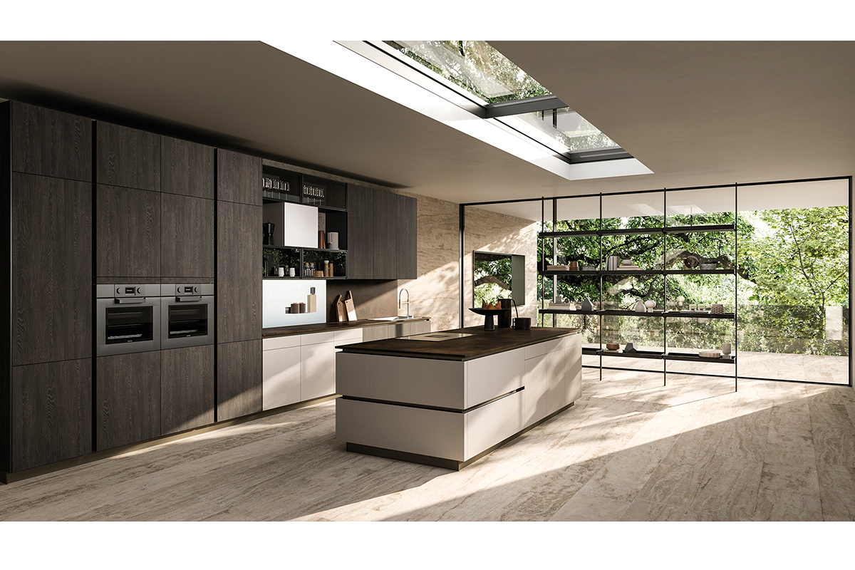 En esta composición concreta, el vidrio acanalado en tono Tortora se combina con madera Rovere Barrique, completada con tiradores integrados y zócalos en acabado titanio.