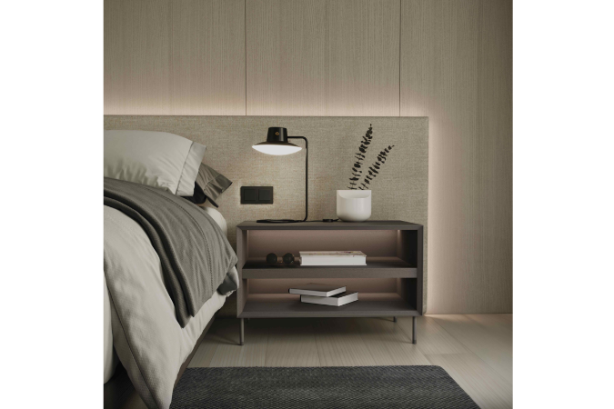 El dormitorio se construye también a través de los detalles. Las piezas auxiliares no solo cumplen una función práctica, sino que refuerzan la armonía del conjunto. En este sentido, las mesitas adquieren un papel clave. La colección AD extiende su lenguaje a la zona de noche mediante módulos que integran un contorno perimetral superior que actúa como tirador, enmarcando el volumen y definiendo su carácter. Sus dos sistemas de sustentación, pata metálica o estructura de madera, permiten adaptar su presencia manteniendo una estética sobria y precisa.