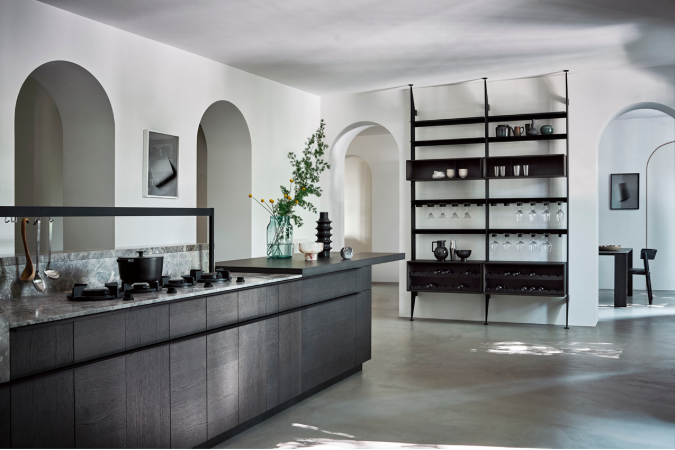Las columnas, también en Rovere Fossile Intarsio con tirador Tratto, prolongan la coherencia material del conjunto. El sistema The 50's, con estructura en negro satinado cepillado y módulos abiertos en madera, introduce ligereza y conexión entre espacios. La vitrina Unit, con estructura en aluminio negro, puertas y baldas en cristal Fumé e interior en madera, aporta transparencia y profundidad, mientras la mesa Solido en Rovere Fossile completa la escena, extendiendo el lenguaje de la cocina hacia la zona de día.