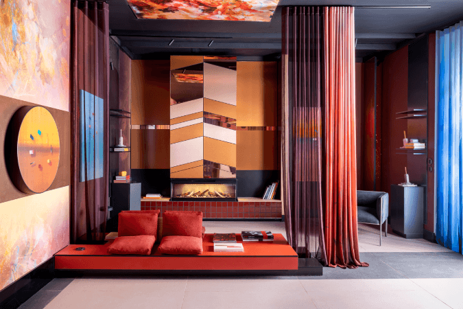 En esta fusión entre diseño, arte y tecnología, cuyo objetivo es crear un entorno sensorial pensado para nuevas formas de habitar y experimentar el retail, las superficies Broadview Materials adquieren gran protagonismo. Los materiales Homapal®, Formica®, Arpa® y FENIX® construyen un universo propio de diseño y contrastes, reforzando la riqueza cromática del espacio a través de múltiples aplicaciones. Homapal® destaca por sus acabados metálicos en tonos cálidos y oscuros (cobres, bronces y negros), combinados con efectos espejo y texturas. En contraste, FENIX® introduce un acento azul intenso de acabado mate y sedoso. Por su parte, Formica® equilibra la propuesta con tonos suaves y sólidos, como un rosa cálido y un azul denim, y cautiva con un negro brillante. Finalmente, Arpa® muestra un rojo profundo y de carácter terroso.