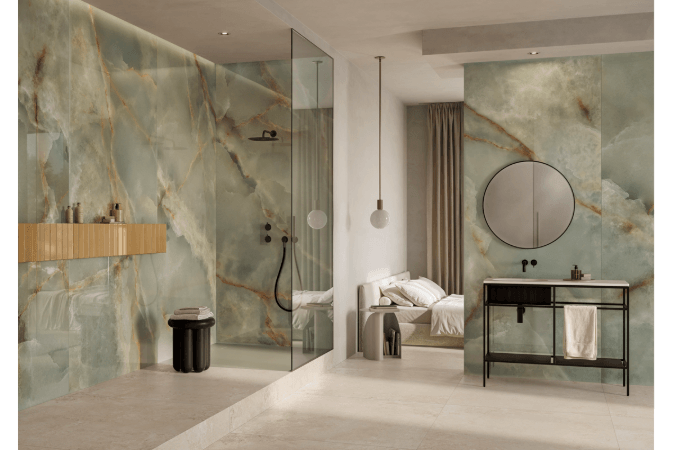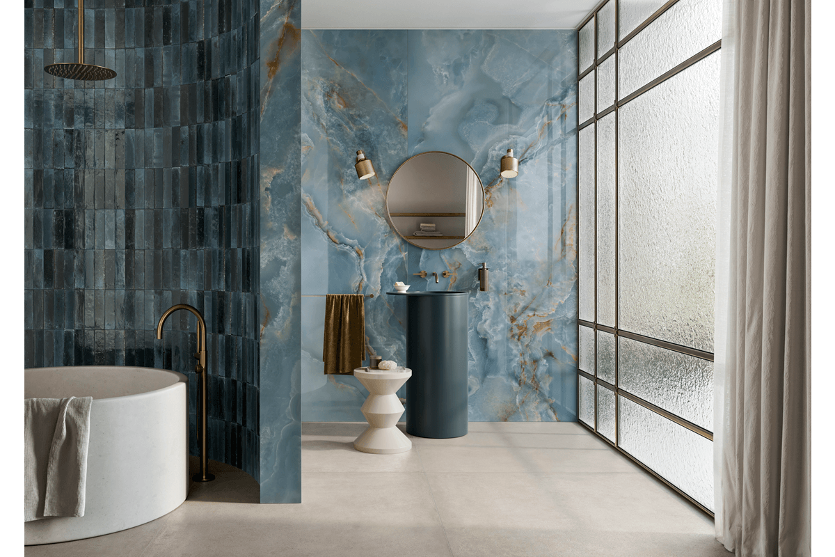 La colección se enriquece ahora con cinco nuevos acabados inspirados en el ónix – Avorio, Venato Avorio, Perla, Blu y Verde. Cada uno se combina con el mosaico Ventaglio, que aporta movimiento y sofisticación al diseño. Altamente versátiles, estos nuevos tonos se adaptan de forma natural a espacios residenciales y comerciales de alta gama – desde baños de diseño hasta boutiques de lujo – y permiten composiciones tono sobre tono o contrastes materiales con superficies efecto madera, cemento o piedra.
