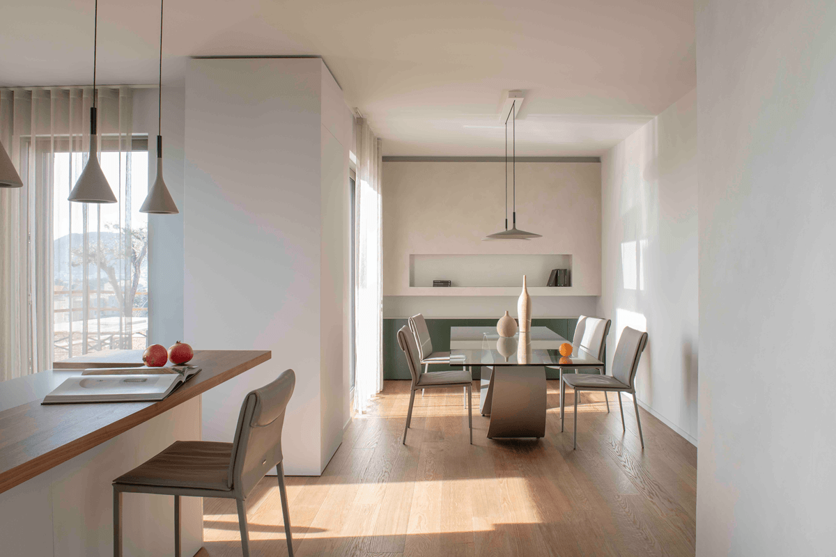 La distribución espacial se articula en torno a un principio de continuidad. Los sistemas de mobiliario se conciben como "paredes activas": elementos discretos que organizan sin dividir, guiando la transición entre funciones y preservando al mismo tiempo la permeabilidad visual. En este equilibrio, las superficies desempeñan un papel fundamental. Las paredes, acabadas en yeso fino (intonachino), revelan una textura vibrante que interactúa con la luz, realzando los volúmenes y alterando la percepción espacial a lo largo del día —una referencia constante a la materialidad de la arena y la piedra de Liguria.