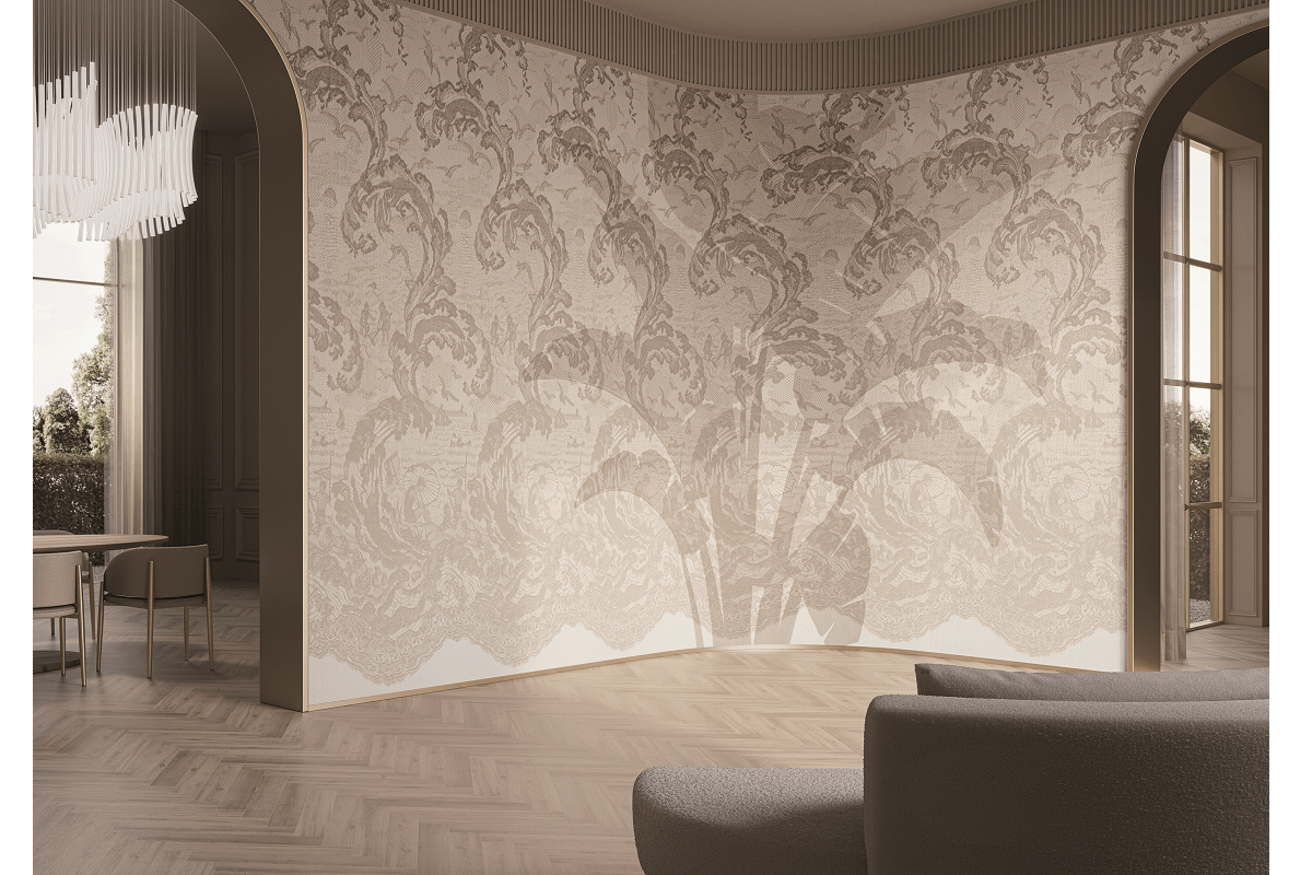En los revestimientos murales de Glamora, la superficie dialoga con la luz y con el diseño a través de motivos inspirados en la naturaleza, acabados satinados y reflectantes, y efectos de luz y sombra.