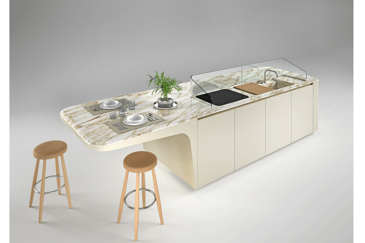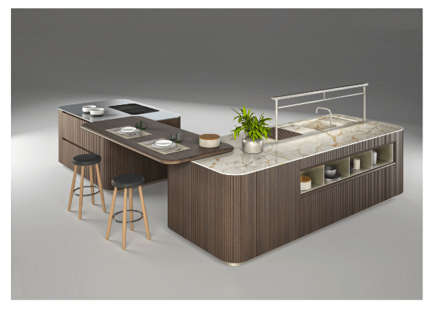 Diseñado por el arquitecto y director artístico de la compañía, Giuseppe Bavuso, este espacio culinario abierto y expandido representa una nueva forma de convivencia. La cocina comparte lugar con otras estancias de la casa, como el salón y el comedor, ofrece una estructura envolvente, que da cobijo a los usuarios para que puedan socializar y conversar con quien está al otro lado de los fogones. Responde también a un diseño dinámico que no termina su finalidad con la elaboración de la comida, sino que continúa después de servirla. En este ambiente se entremezclan las texturas, los colores, los materiales y también se le da importancia a la sostenibilidad a través del uso de soluciones reciclables.