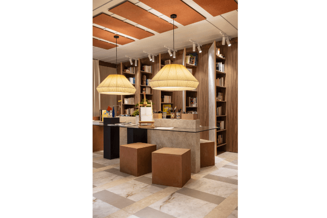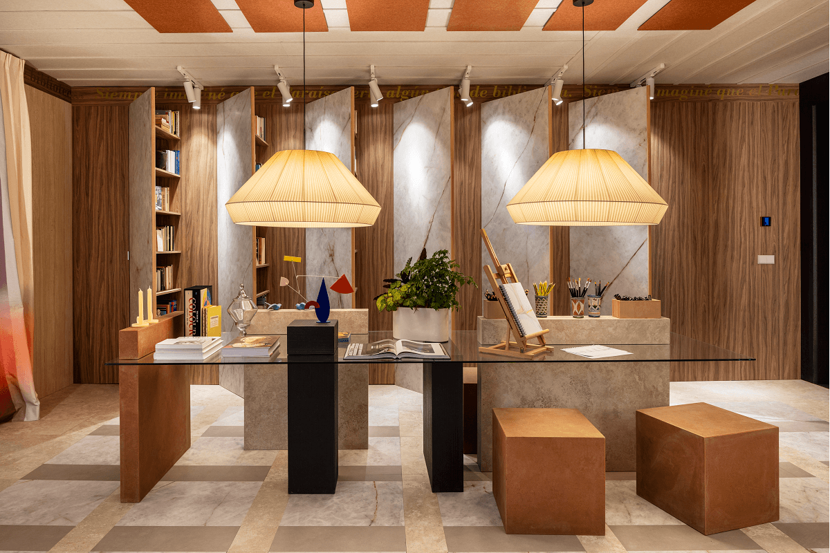 En la instalación 'Entre superficies y palabras', que viene de la mano del estudio de interiorismo PersonalK, la firma plantea un espacio que invita a quedarse, leer y compartir, donde sus superficies cobran protagonismo y ayudan a crear un espacio cálido, luminoso, lleno de contrastes, de texturas y profundidades. A su vez, se combinan con otros materiales y piezas, creando una atmósfera acogedora y envolvente.