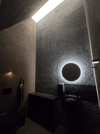 Insistió en que la luz es parte imprescindible de la arquitectura. Se ha llevado al espacio un juego entre llenos y vacíos. La atmósfera es calmada y fría, pero el producto de LAUFEN resalta con un carácter doméstico. Remarcó que "son unos baños muy peculiares, que transmiten un balance, una atmósfera oscura, pero con una iluminación controlada, con nichos muy dirigidos, para dar sensación de que no se entra en una cueva, sino que una se pueda sentir como en casa".