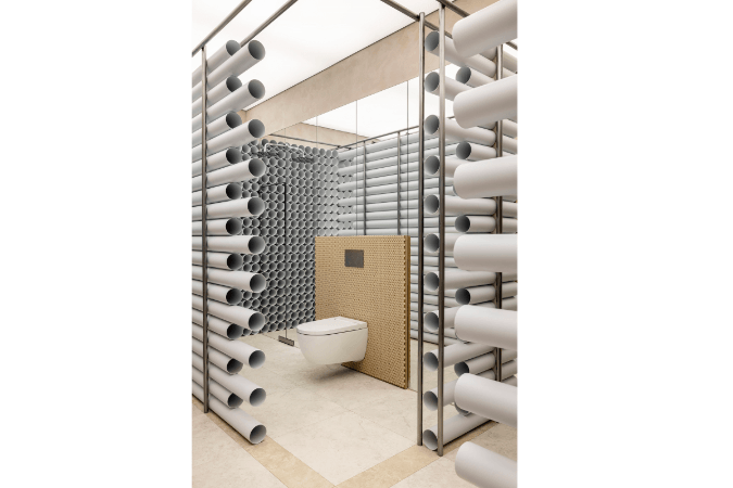 El equipo de Zooco, formado por los arquitectos Sixto Martín, Miguel Crespo y Javier Guzmán, propone en esta ocasión un proyecto que pone en valor los elementos esenciales que suelen quedar ocultos. El espacio sustituye el tabique tradicional por una estructura ligera de tubos que deja a la vista el sistema circulatorio del edificio. Se trata de un espacio conceptual que se convierte en fuente de inspiración para descubrir la esencia de las instalaciones de agua y cómo se expresan, por delante de la pared del baño, con elementos del mejor diseño y la tecnología más innovadora como el inodoro bidé AquaClean Alba o el pulsador ultrafino Sigma40.