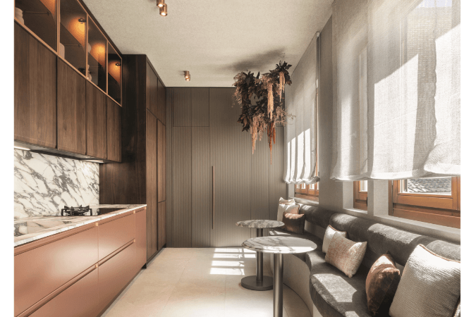En la cocina 'Arquitectura del sabor', diseñada por Mar Gausachs para el espacio Bauhaus, el Fior di Viola 4D acabado Cashmere en 12 mm reviste la encimera, mientras que el fregadero está realizado en Marsala Red Natural en 12 mm: una combinación que juega con la tensión cromática entre el burdeos del Fior di Viola y el tono más terroso del Marsala, llevando la cocina de un espacio funcional a un verdadero elemento arquitectónico del hogar.