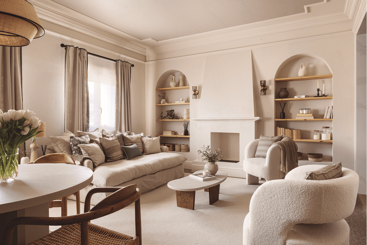 Las cortinas aportan ligereza y movimiento, modulando la entrada de la luz y contribuyendo a crear atmósferas suaves y envolventes. En el corazón del espacio, una chimenea de vapor de agua actúa como elemento central, reforzando la sensación de hogar y generando un punto de calidez visual y emocional.