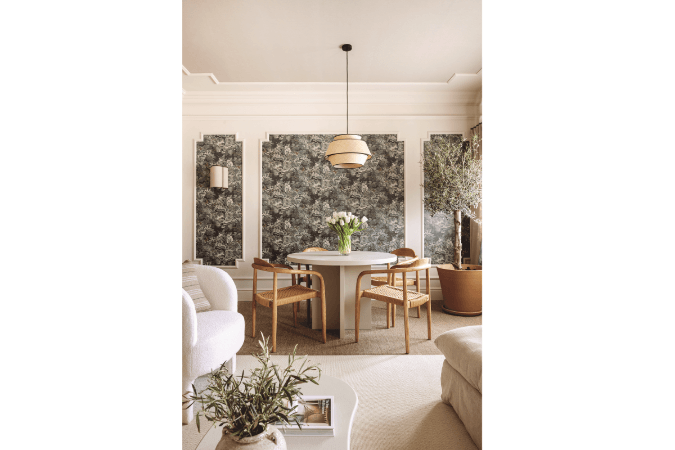 Las paredes se reinterpretan como soporte creativo, incorporando soluciones que amplían las posibilidades decorativas: papeles pintados aplicados en techos o enmarcados con molduras que aportan profundidad, textura y una nueva forma de entender los revestimientos.