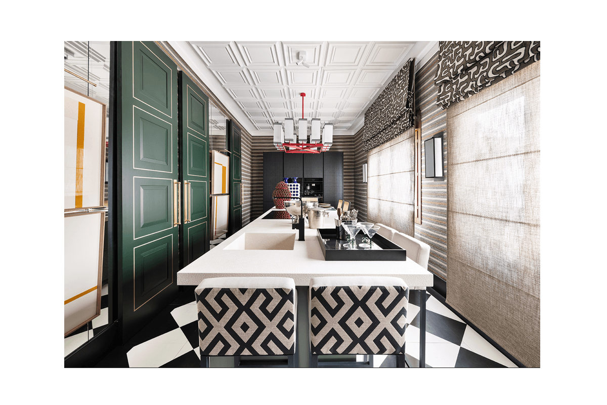 Los tonos verdes, la luz filtrada a través del vidrio y la percepción de la cúpula como una jaula de cristal definen la atmósfera del espacio, donde se recupera la esencia palaciega de la arquitectura original — molduras, grandes puertas, suelos con patrones clásicos y paredes enteladas — para contrastarla con un diseño de cocina contemporáneo, depurado y funcional.
