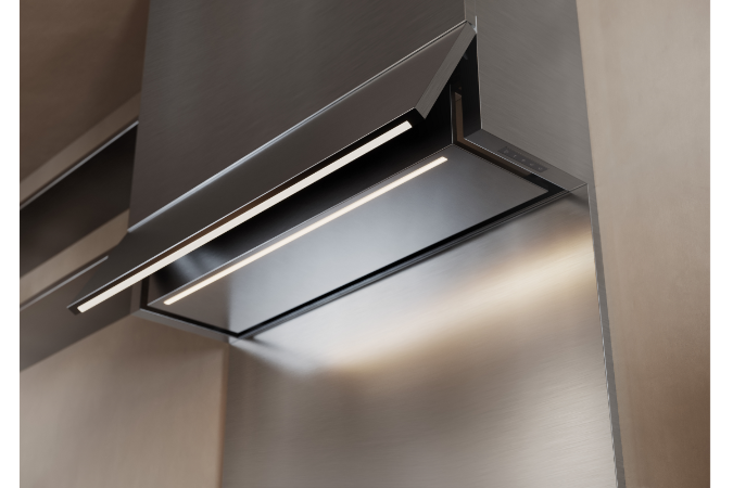 3. Campanas extractoras. Dos interpretaciones, una única visión: la campana deja de ser un elemento técnico para convertirse en una presencia escultórica, transformando su función en un gesto de elegancia. Una versión con una delicada forma en T: la campana se extiende con ligereza sobre la encimera. Una línea horizontal, esencial y decidida. Es un gesto arquitectónico que recoge los humos y difunde una luz nítida.