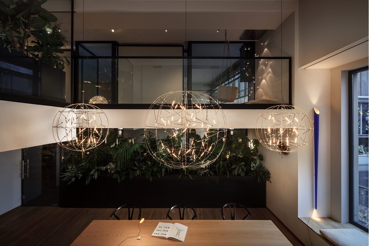 Las voluminosas esferas suspendidas de Pòta!, disponibles en dos diámetros diferentes, iluminan con gran personalidad la zona de reuniones dentro del amplio espacio diáfano —visible directamente desde los ventanales que dan a la calle—, mientras que la refinada composición geométrica de su versión de pared define la zona de recepción. Por su parte, los reflejos dorados aportan calidez a la sala de reuniones de la planta superior, gracias a una llamativa composición a medida de Gold Moon, que se convierte en el punto focal del espacio.