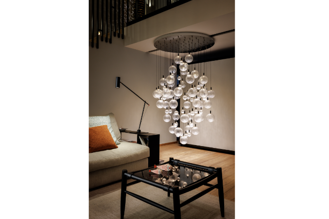 Junto a estas nuevas incorporaciones, toma forma una colección rica y articulada de creaciones, diversa pero perfectamente coherente, que incluye Ensō de pared y Cono, la lámpara de araña Par 18 con su ritmo de esferas transparentes, y Ettorino en su versión de mesa. También están las "gotas" de luz de Jackie O, la delicada flor For You, las evocadoras Syphasera y Syphasfera que iluminan la vegetación del espacio, y muchas otras lámparas de la colección, desde Bellatrix hasta las refinadas lámparas empotradas Pepita, todas ellas situadas en espacios diseñados para ser vividos.