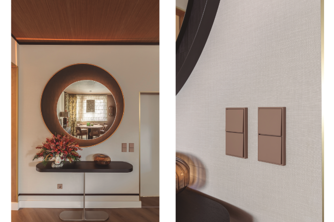 Ambas series pueden verse en Casa Decor con acabados en algunos de los 63 colores de Les Couleurs® Le Corbusier®, exclusivos de JUNG, cuyas ilimitadas combinaciones consiguen estructurar, delimitar y conectar espacios en perfecta sintonía. También están presentes otros acabados metálicos como el acero, el latón y el cromado.
