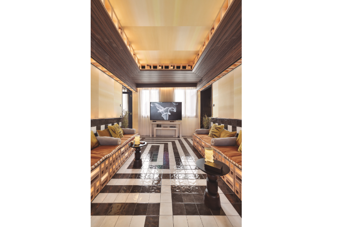 Finalmente —aunque fuera del concepto de "vida sana"—, el club de fumadores 'El viaje del humo' es la propuesta del estudio Impar Design. Su leitmotiv se inspira en los secaderos de tabaco y en los antiguos fumoirs palaciegos del siglo XIX. La estancia cuenta con celosías que filtran la luz natural para crear atmósferas cambiantes, mientras que la madera, los mosaicos y el solado con azulejos se integran con la artesanía y la arquitectura sensorial.