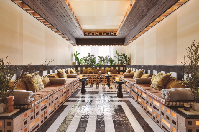 Otro espacio para el disfrute y la gastronomía es el salón comedor de S de Studio, 'La vie, chez nous', dentro del espacio promocional de PH Collection. El diseño se inspira en la estética de los años setenta para crear un ambiente de relajación, con maderas y textiles envolventes que se combinan con patrones geométricos y tonos naranjas y verdes.