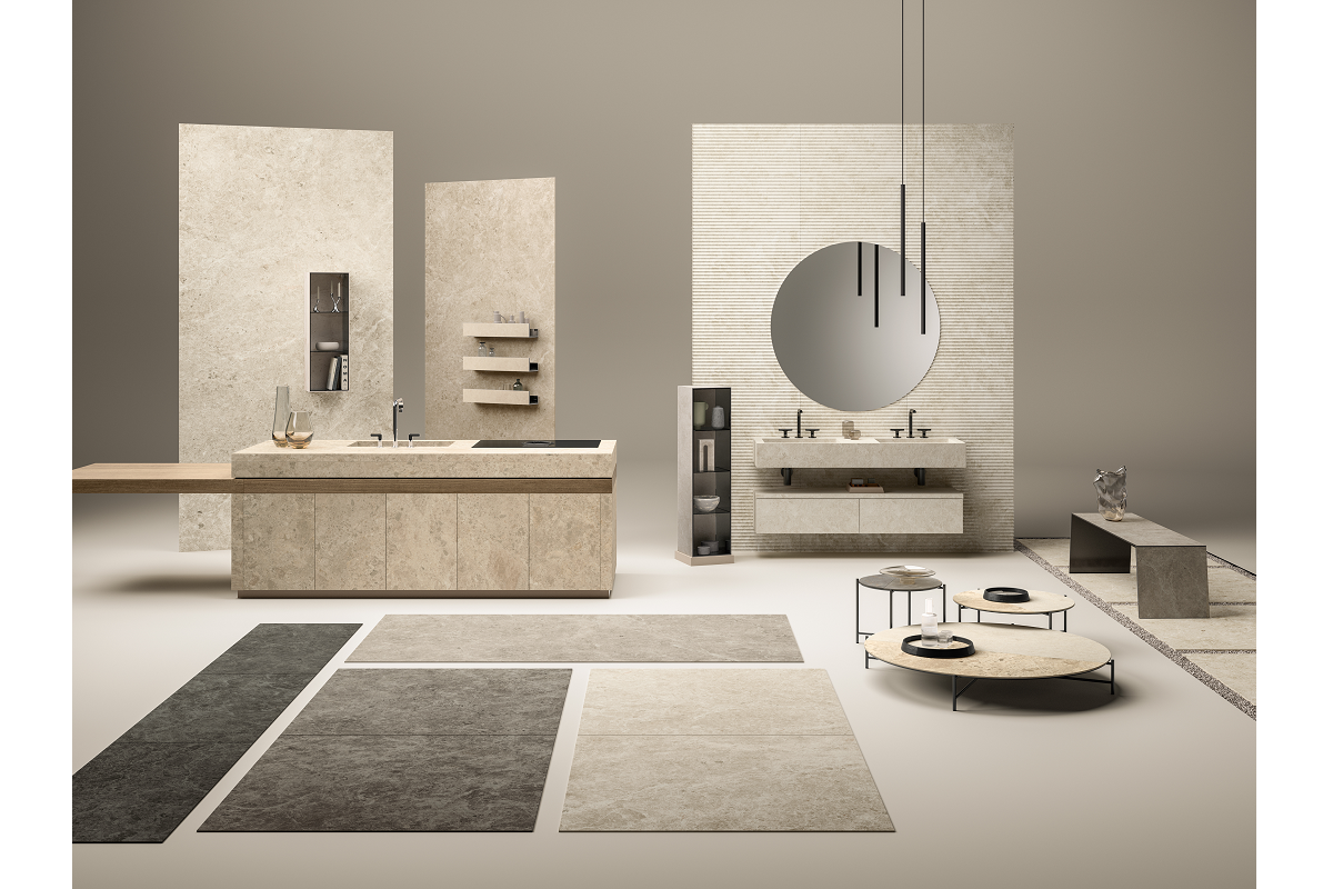 El recorrido se abre con dos ambientes de baño y una cocina de gran impacto escenográfico. En la pared izquierda, un ambiente de baño tono sobre tono tiene como protagonista la colección efecto piedra Nyra, desarrollada en colaboración con Studio Alberto Apostoli. Nyra está presente tanto en pared, con 3D Saddle, elemento tridimensional caracterizado por relieves horizontales, como en el lavabo monobloque Armonia, una pieza de baño sencilla y elegante.