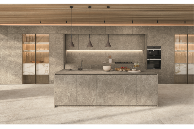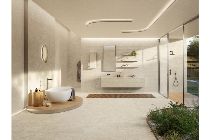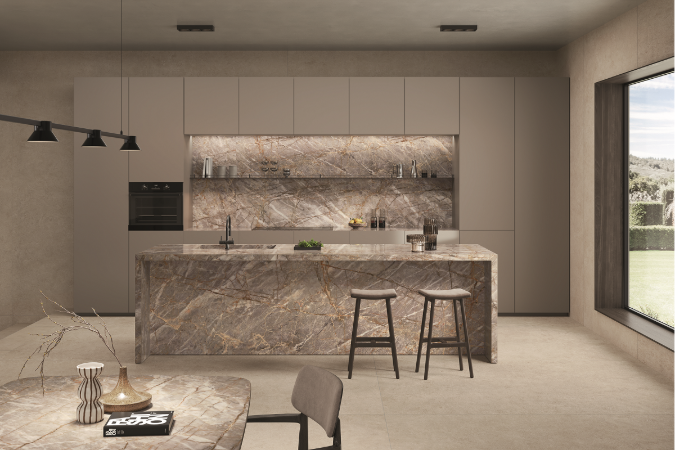 La cocina, otro de los núcleos centrales de la Concept Home, expresa plenamente el concepto de One Space gracias al uso de grandes placas efecto mármol para paredes, pavimentos y encimera. Inspiradas en el atractivo auténtico de Cristallo Roots, las grandes placas efecto mármol Marvel Epic Natural Roots, elegidas para la encimera y el backsplash, se distinguen por sus vetas blancas, avellana y doradas, que aportan calidez y profundidad al fondo beige-avellana. La combinación equilibrada de tonos cálidos y contrastes luminosos crea una sensación de conexión con la tierra, sin renunciar nunca a una sofisticada elegancia: un equilibrio perfecto entre fuerza matérico-expresiva y refinamiento estético. En armonía con el conjunto, para la pared y el pavimento se han elegido las placas Travertino Navona White, ideales para revestimientos y superficies de diseño sobrio y refinado. El fondo blanco cálido, recorrido por delicadas vetas tono sobre tono, confiere a la superficie un aspecto natural y armonioso.