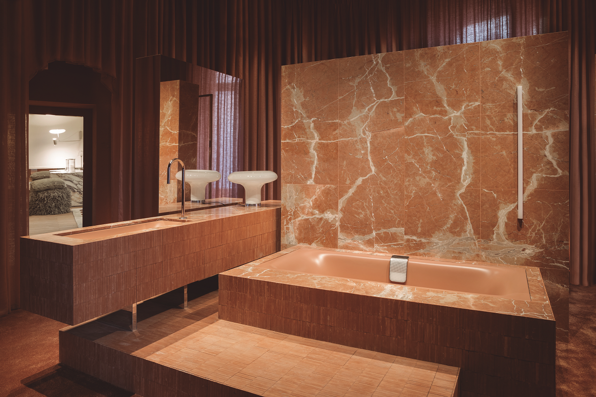 Este enfoque está directamente vinculado con el origen de la colaboración con Kaldewei, que surgió de un proyecto actualmente en fase de desarrollo en San Sebastián. Allí, junto al arquitecto Ignacio Quemada, el estudio de la interiorista está transformando un antiguo teatro en un hotel. Fruto de ese proceso, la marca desarrolló productos en un color especial de terracota cuya materialidad y tonalidad se han trasladado ahora a Casa Decor como parte esencial del concepto.